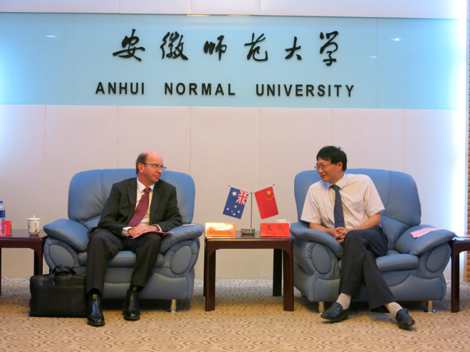 随后,西蒙校长也向王伦校长介绍了达尔文大学的概况。他说,现在达尔文大学也正在积极开拓海外市场,加强合作办学。加大学校的国际化,是两校共同的愿望和目标。学校在很多理科专业有较强的优势,所以这次尤其想和安师大各个理科院系的专家们进行交流,探讨各种学术合作形式的可能性。