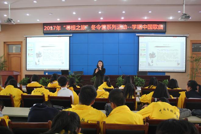本网讯(安徽师范大学冬令营 丁玲玲 张银丹)“好一朵美丽的茉莉花,好一朵美丽的茉莉花,芬芳美丽满枝丫……”10月23日上午,2017年海外华裔青少年“中国寻根之旅”冬令营—安徽师范大学营的全体营员及志愿者在安徽师范大学花津校区会议中心第三报告厅开展学唱中国歌曲活动,音乐学院王光丽老师主讲。