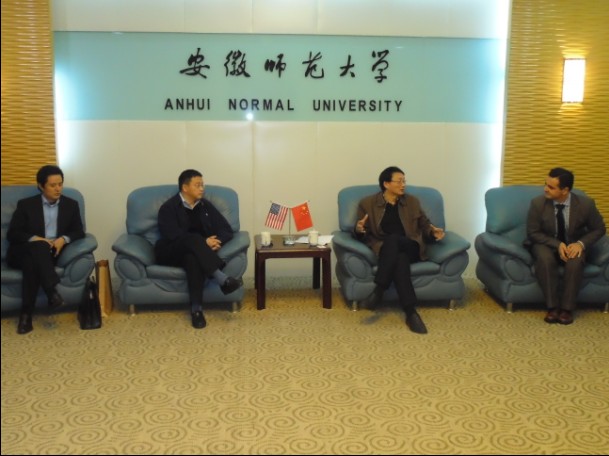 讲座开始前,校长王伦会见了两位来宾。王校长谈到西方的高等教育有他们的独到之处,中国的基础教育也有我们的独到之处,我们要吸取西方高等教育的精华,探索出一条适合中国的高等教育之路。王校长说,虽然现在我们国际化交流的大门已经打开了,但是还有许多障碍,比如语言就是一个急需要解决的问题。希望我们的合作能从最容易的地方开始,然后不断走向深入。王校长预祝两位来宾的晚上演讲圆满成功!两位来宾对王校长的话表示充分认同,也表示很高兴来必赢565net官网访问,并愿意为推动中美高校包括安徽师范大学与他们各自学校的交流与合作作出更大的努力。